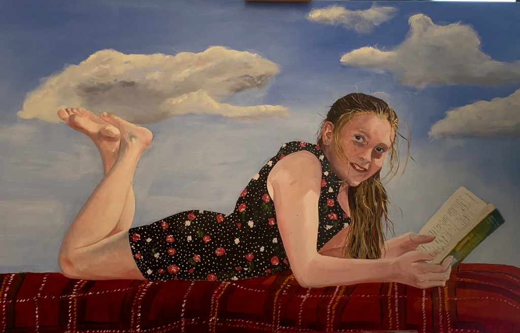 Over the last few weeks I have been finishing the portrait “Joy (Harry Potter)” which shows my daughter Serena, a couple of years ago, enjoying one of her favourite books on a bench we have in the field next to our house.